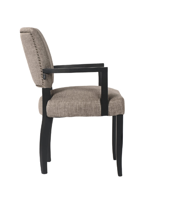 Maggie karmstol i högkvalitativt vävt tyg kombinerar enastående komfort med tidlös design. De robusta träbenen ger stabilitet och hållbarhet, medan de dekorativa nitarna på ryggstödet tillför en sofistikerad detalj som lyfter stolens eleganta utseende. De bekväma armstöden gör stolen perfekt för långa middagar eller avslappnade stunder runt matbordet. Tack vare sitt klassiska och moderna uttryck passar den sömlöst in i både samtida och traditionella miljöer. Det texturerade vävda tyget ger en raffinerad känsla och är lätt att underhålla, vilket gör stolen till ett praktiskt och stilfullt val för ditt hem.