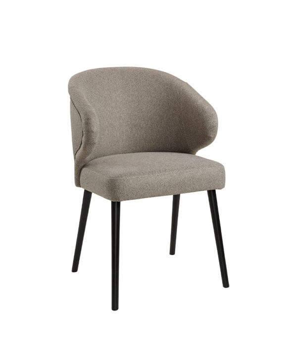 En stilren och bekväm matstol klädd i mjukt tyg med elegant lyster. Den omslutande ryggdesignen och de lätt vadderade armstöden ger ett behagligt stöd, vilket gör stolen idealisk för långa middagar eller möten. De dekorativa sömmarna längs ryggens kontur framhäver det välformade uttrycket och adderar en sofistikerad detalj. Underredet består av lätt utsvängda ben i trä med mörk finish, vilket ger en stabil bas och en diskret kontrast till det ljusa tyget. En mångsidig stol som passar lika bra i matplatsen som i ett mötesrum eller som accentstol i hallen. Material: 100% polyester.