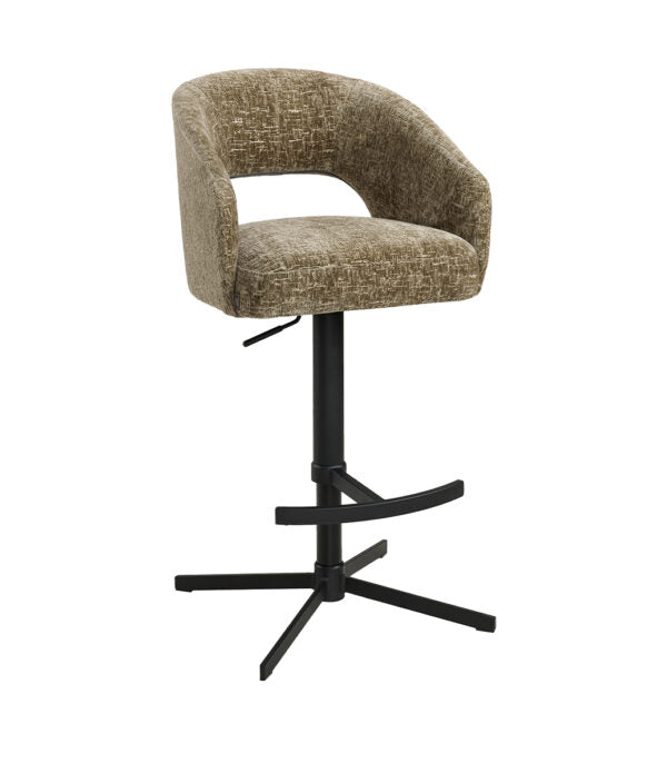 En elegant barstol med mjukt stoppad sits i slitstarkt tyg och en stabil stomme i metall. Den höj- och sänkbara funktionen gör det enkelt att anpassa stolen till olika barmiljöer, köksöar och bardiskar. Det rundade ryggstödet ger extra stöd och komfort, vilket gör stolen idealisk för långa sittningar. Den stilrena designen, i kombination med den funktionella höjdjusteringen, gör denna barstol till ett utmärkt val för både moderna hem och trendiga restaurangmiljöer. Integrerat fotstöd för ökad komfort och rund fotplatta för extra stabilitet.