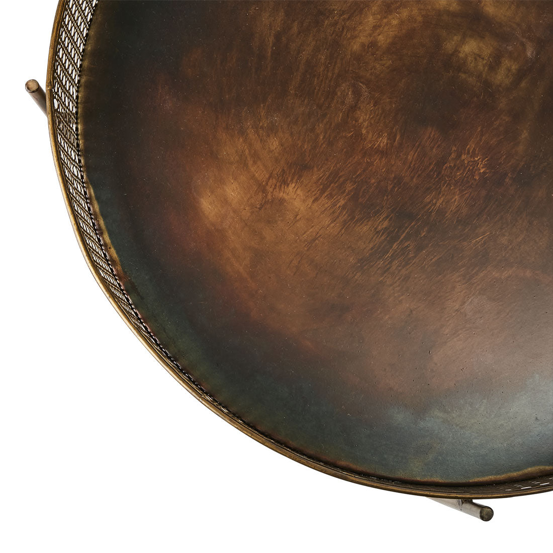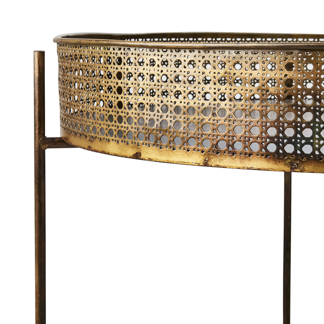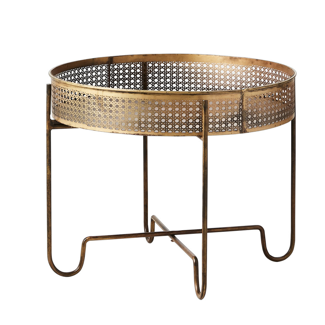 Bordet är tillverkat i järn med en mässingsfärgad finish som ger en elegant glans och en känsla av genuint hantverk. Varje bord är unikt – nyansen kan variera och ytan utvecklar med tiden en naturlig patina, särskilt om den utsätts för fukt. Detta gör att bordet får en levande yta och en charm som bara blir vackrare med åren.